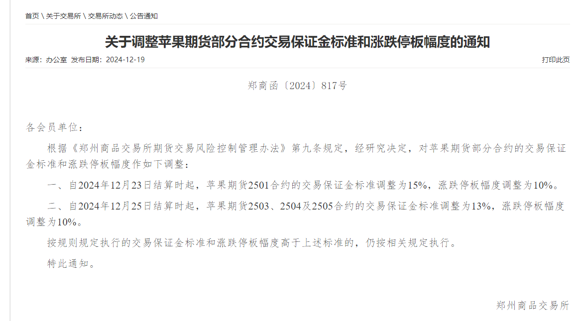 转发关于调整苹果期货部分合约交易保证金标准和涨跌停板幅度的通知