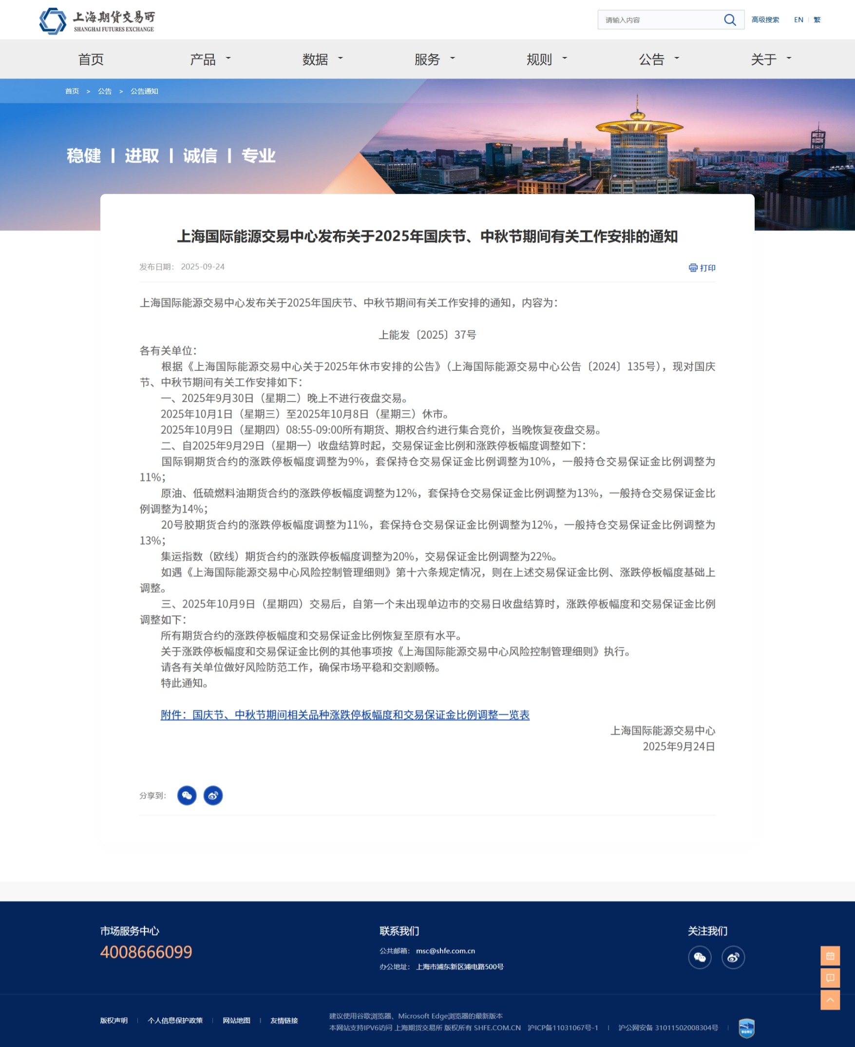 转发上海国际能源交易中心发布关于2025年国庆节、中秋节期间有关工作安排的通知