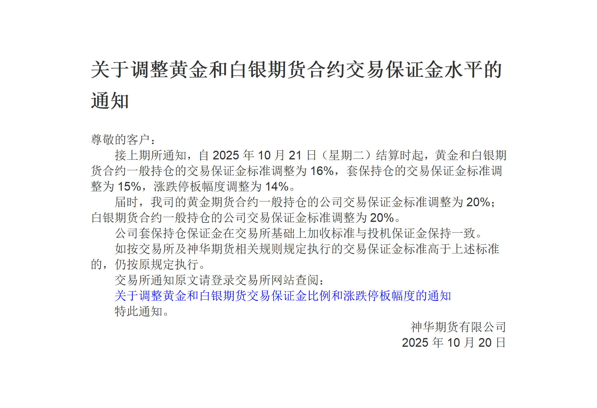 关于调整黄金和白银期货合约交易保证金水平的通知