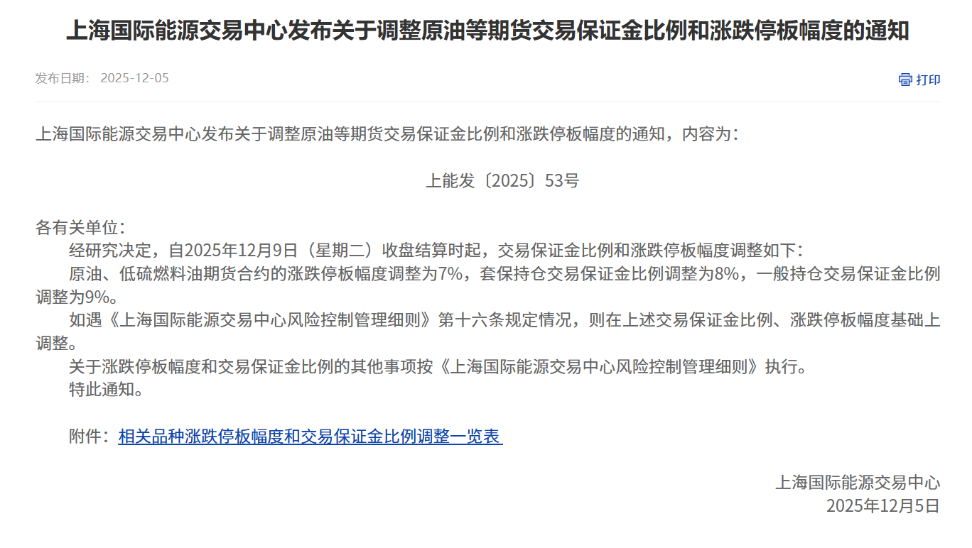 转发上海国际能源交易中心发布关于调整原油等期货交易保证金比例和涨跌停板幅度的通知