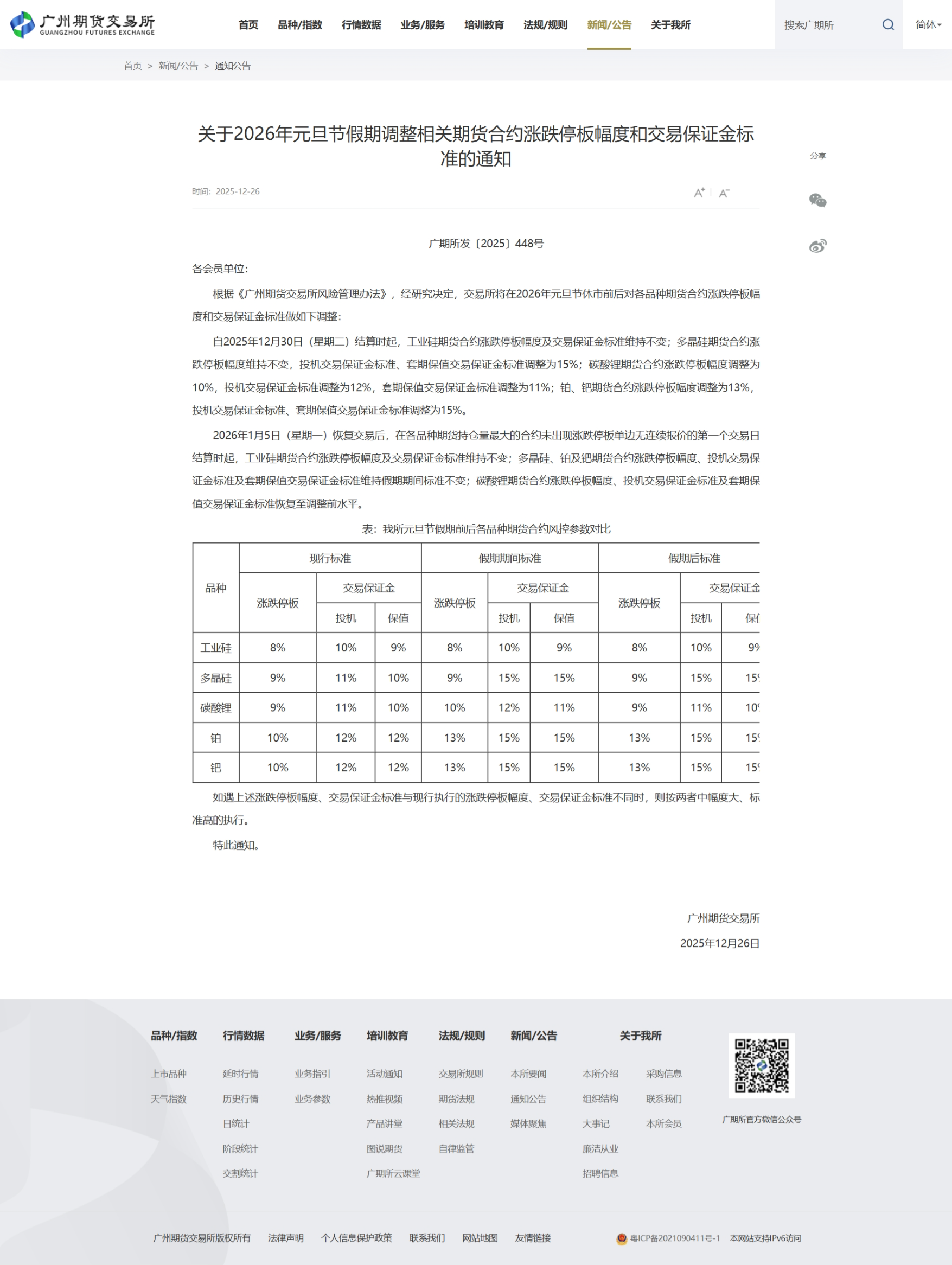 转发关于2026年元旦节假期调整相关期货合约涨跌停板幅度和交易保证金标准的通知