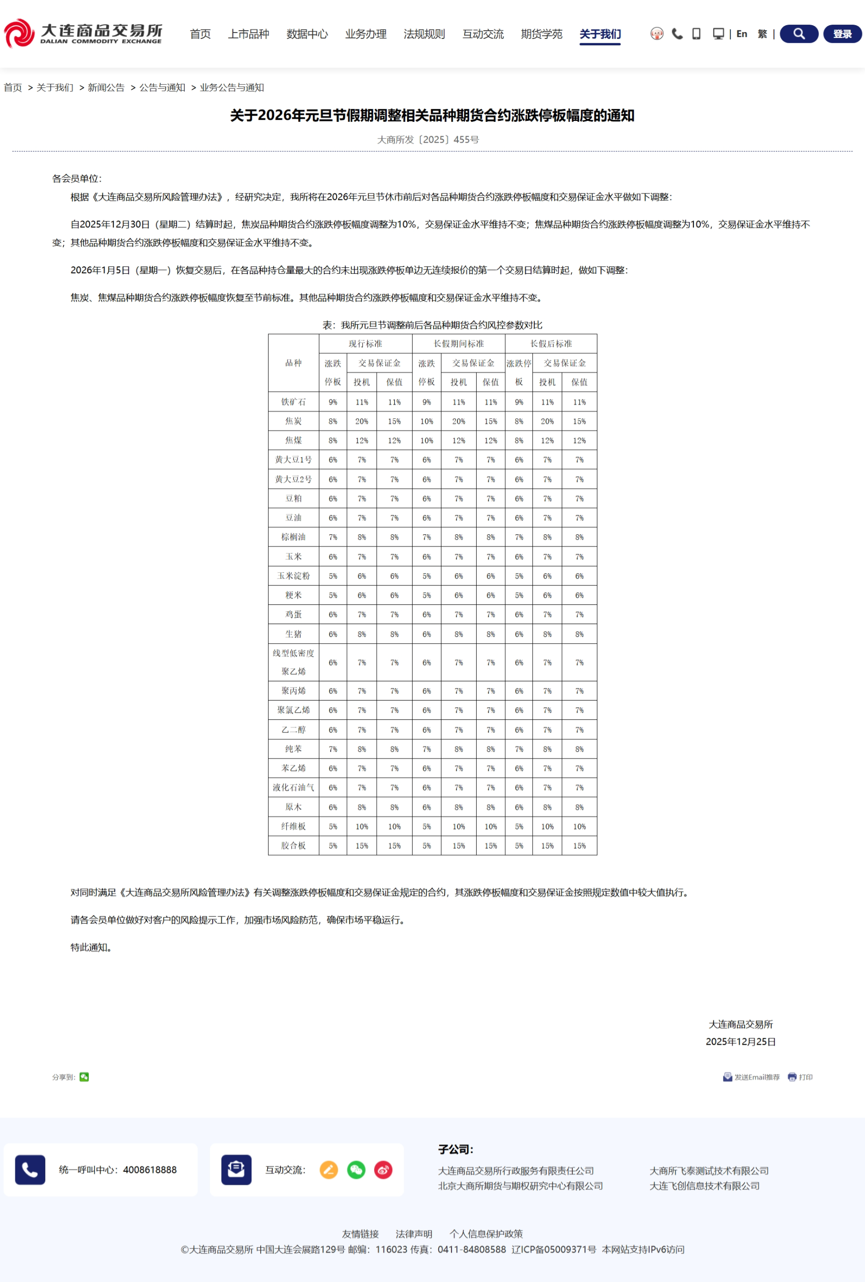 转发关于2026年元旦节假期调整相关品种期货合约涨跌停板幅度的通知