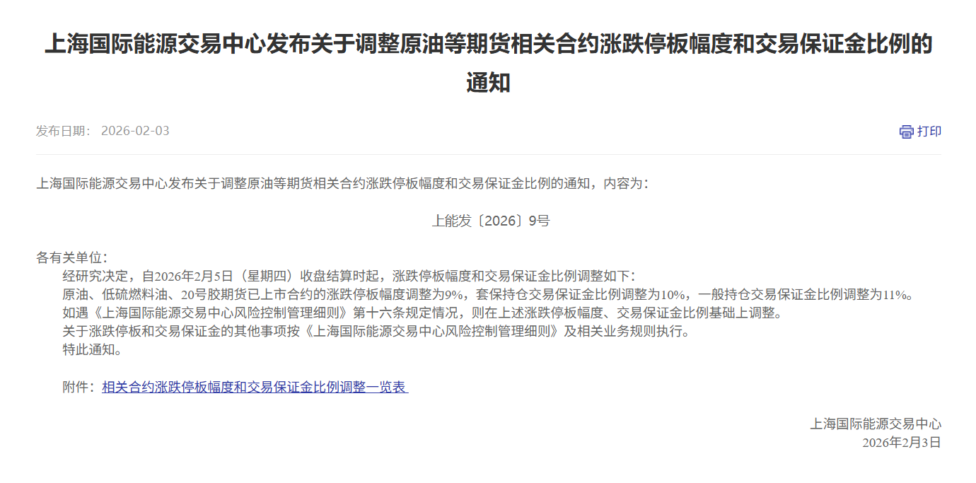 转发上海国际能源交易中心发布关于调整原油等期货相关合约涨跌停板幅度和交易保证金比例的通知