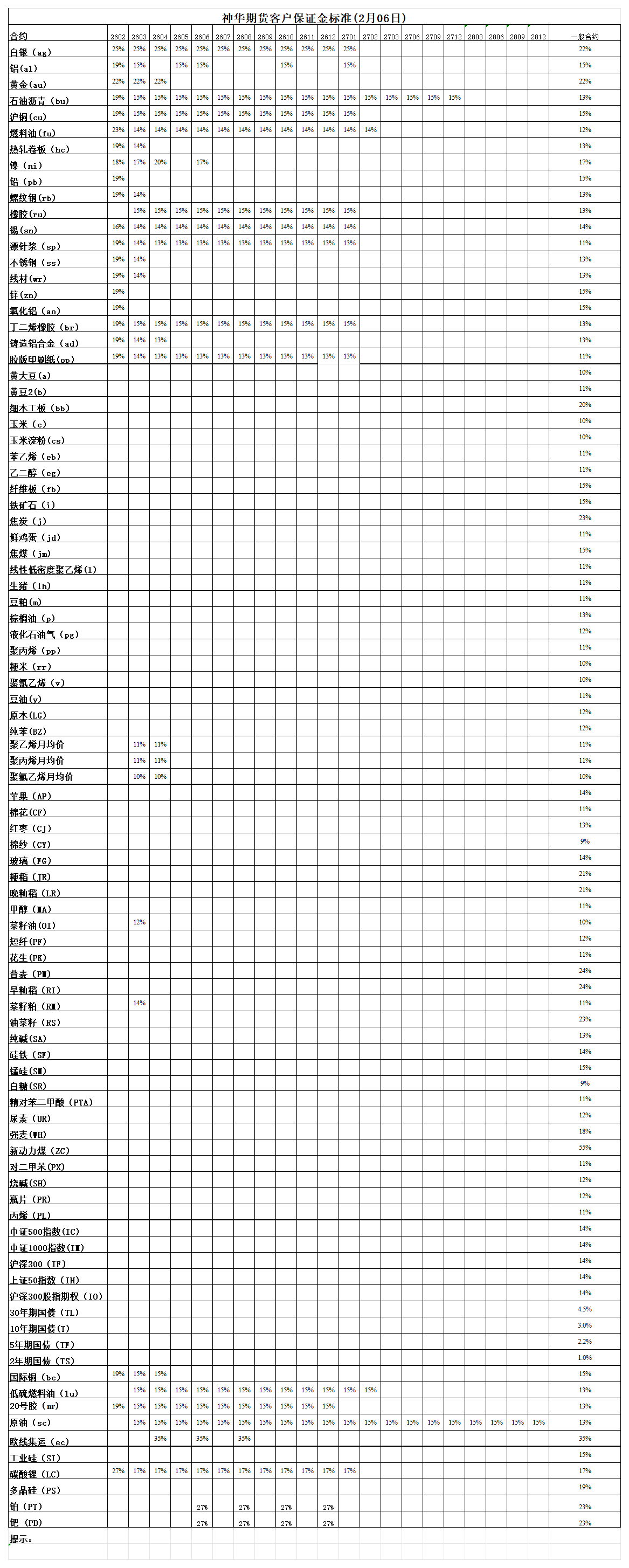 神华期货客户保证金标准(2月6日)