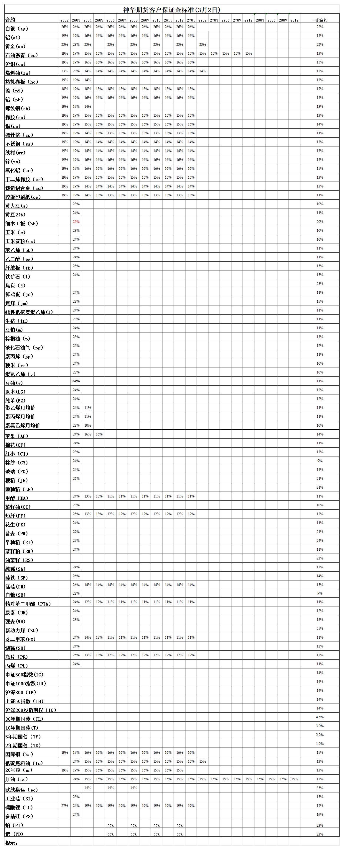 神华期货客户保证金标准(3月2日)