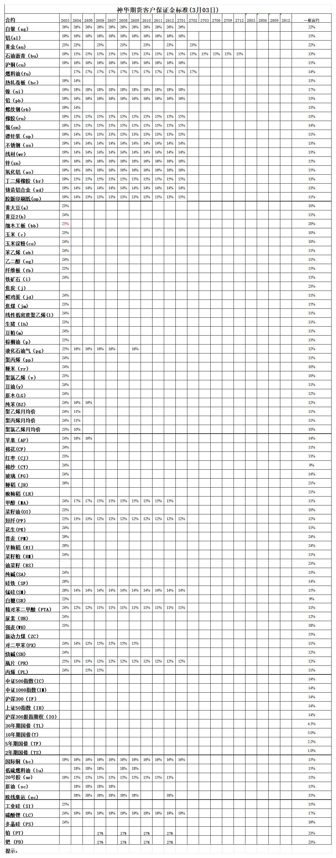 神华期货客户保证金标准(3月3日)