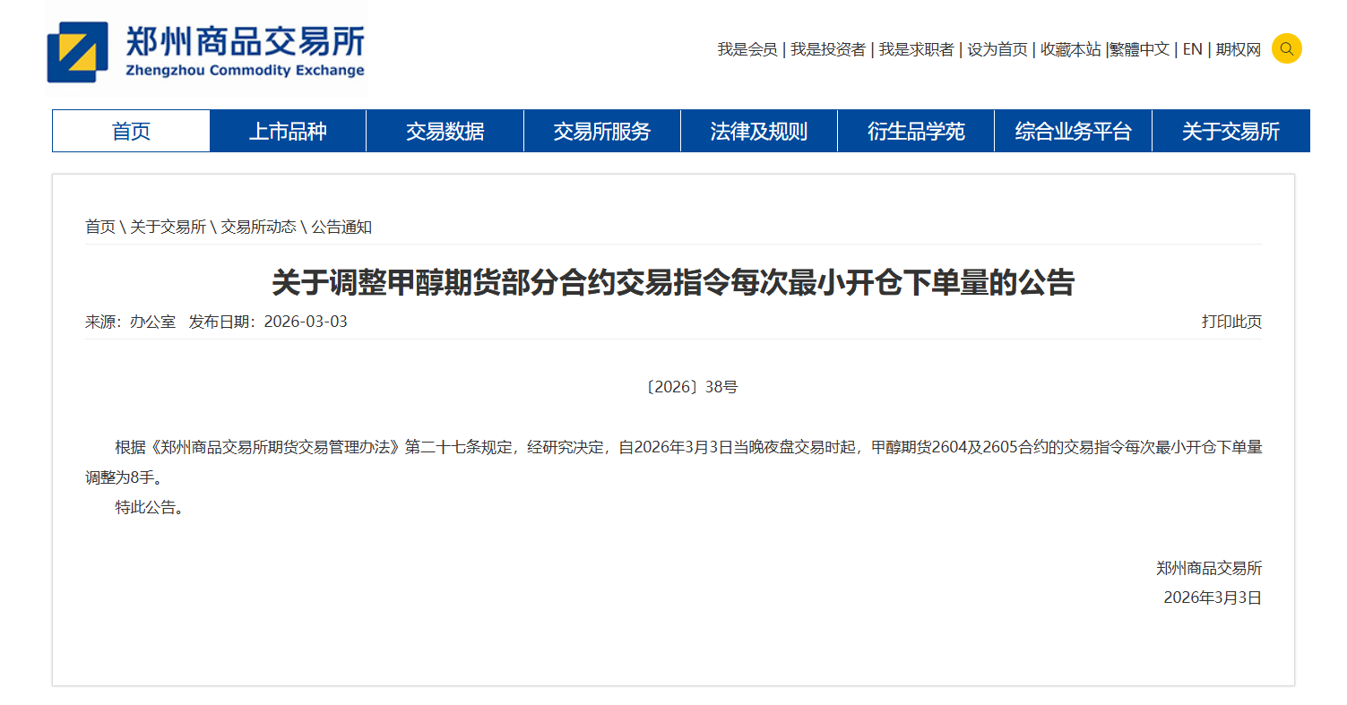 转发关于调整甲醇期货部分合约交易指令每次最小开仓下单量的公告