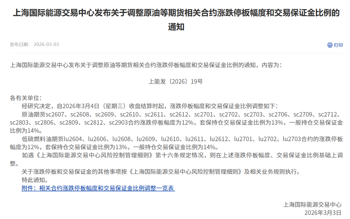 转发上海国际能源交易中心发布关于调整原油等期货相关合约涨跌停板幅度和交易保证金比例的通知