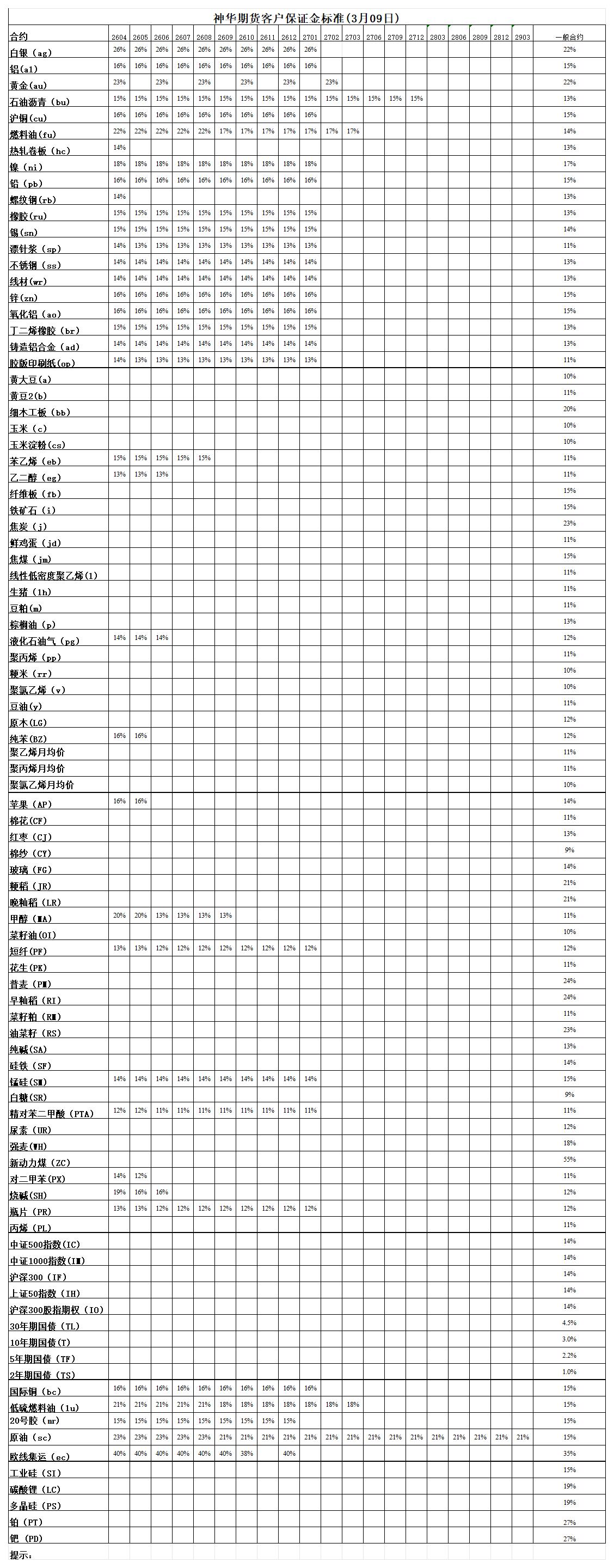 神华期货客户保证金标准(3月9日)