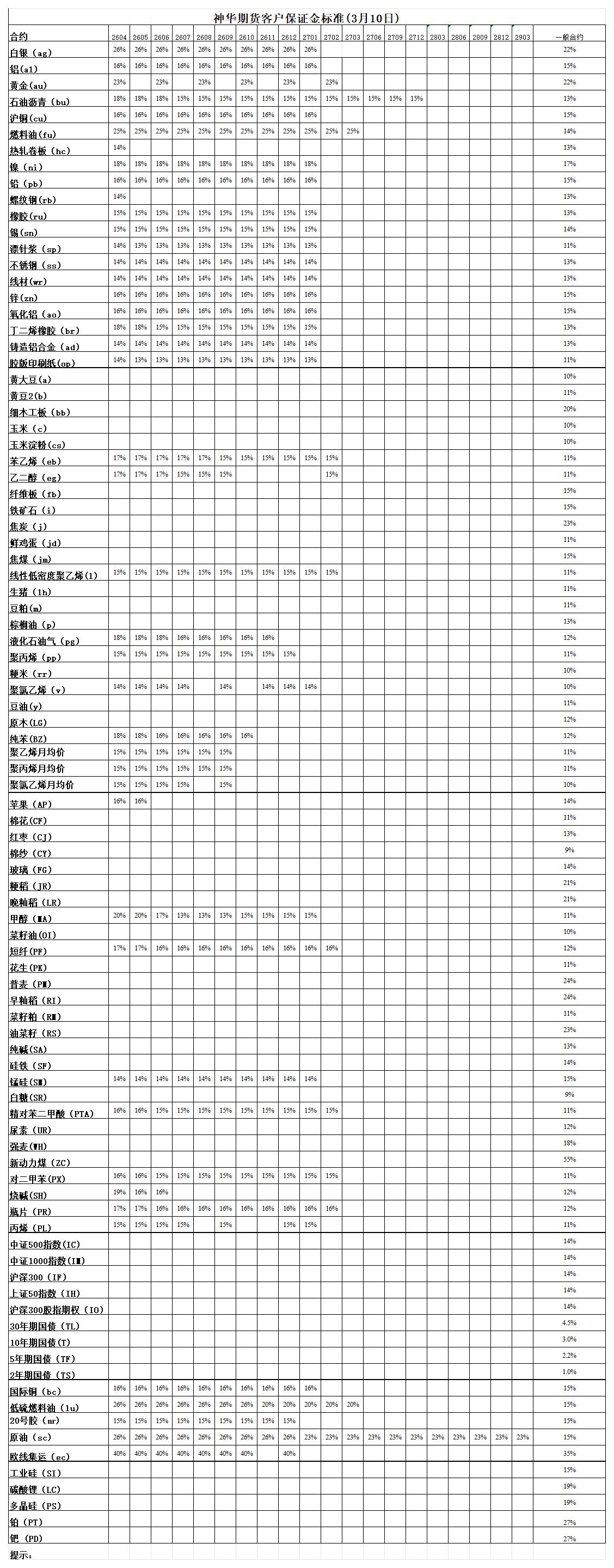 神华期货客户保证金标准(3月10日)
