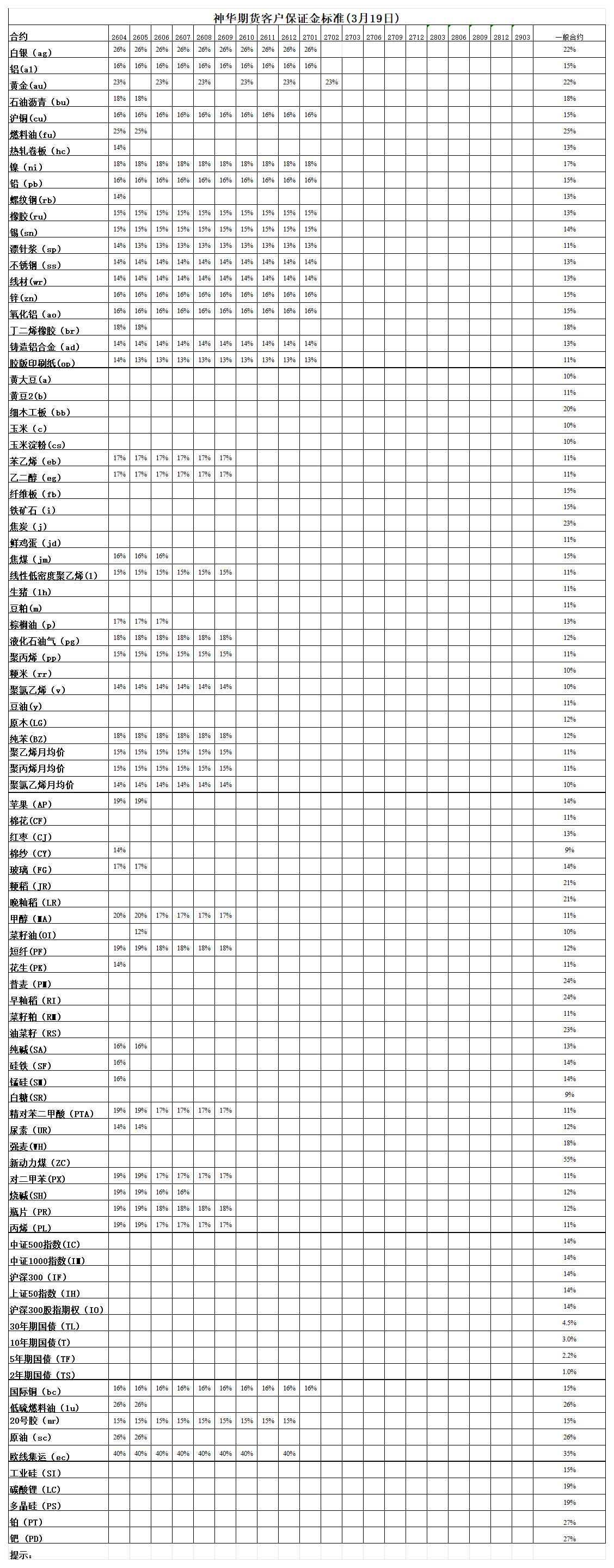 神华期货客户保证金标准(3月19日)