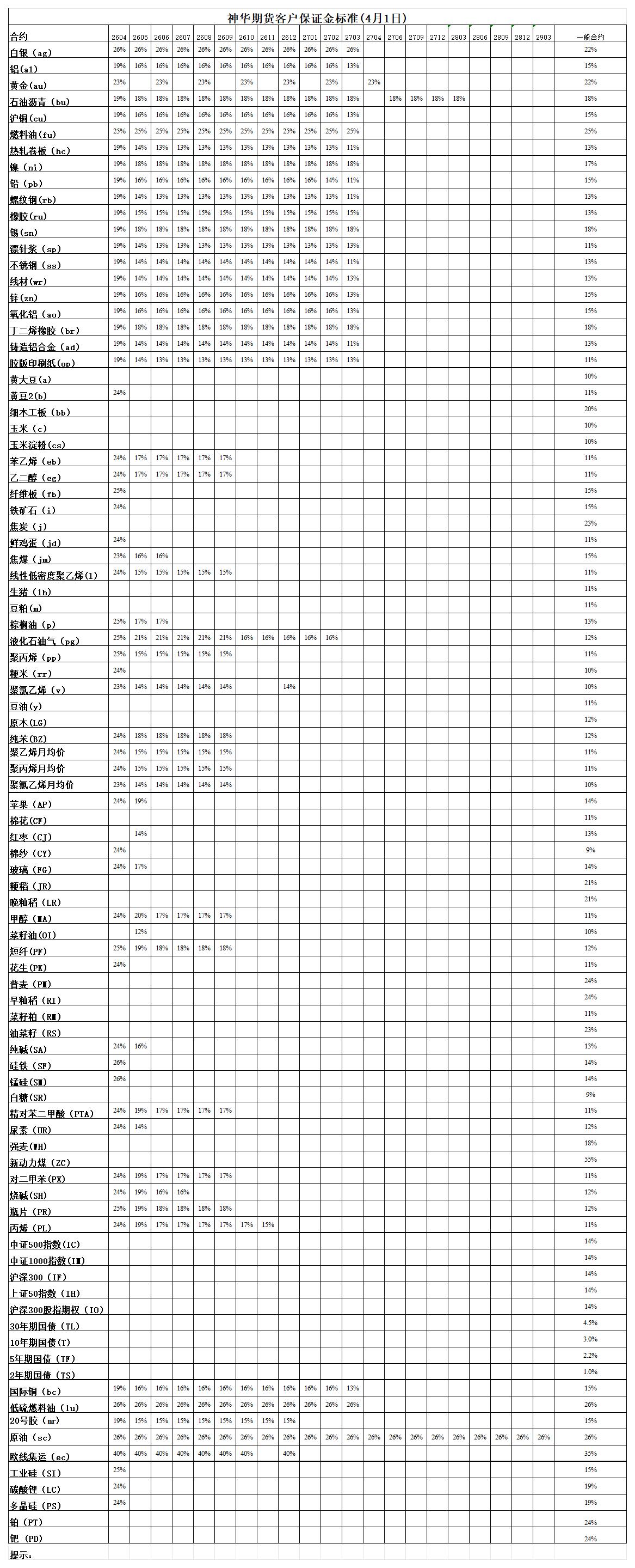 神华期货客户保证金标准(4月1日)