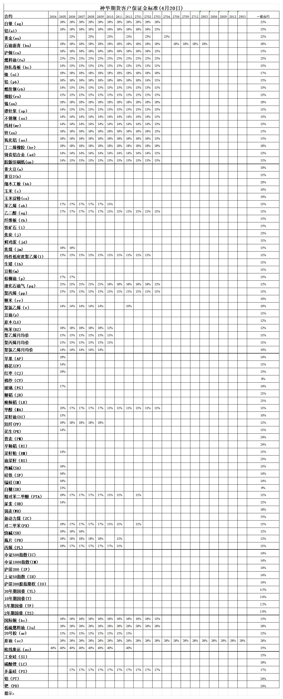 神华期货客户保证金标准(4月20日)