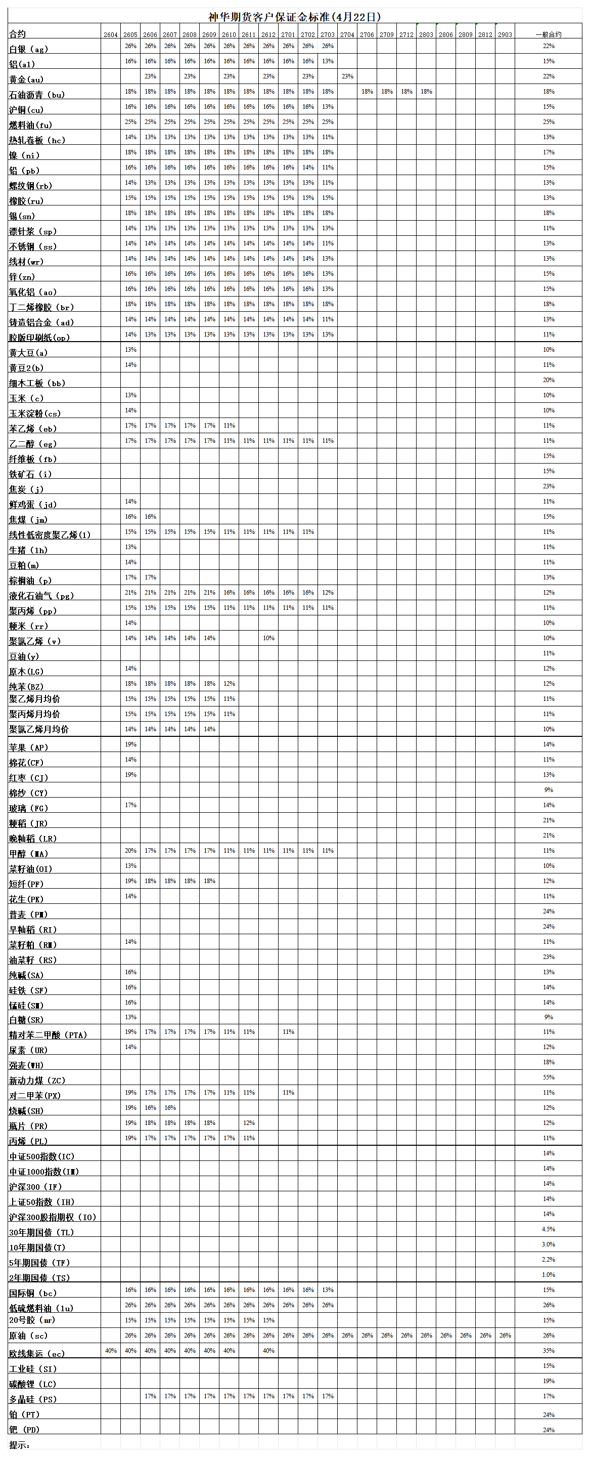 神华期货客户保证金标准(4月22日)