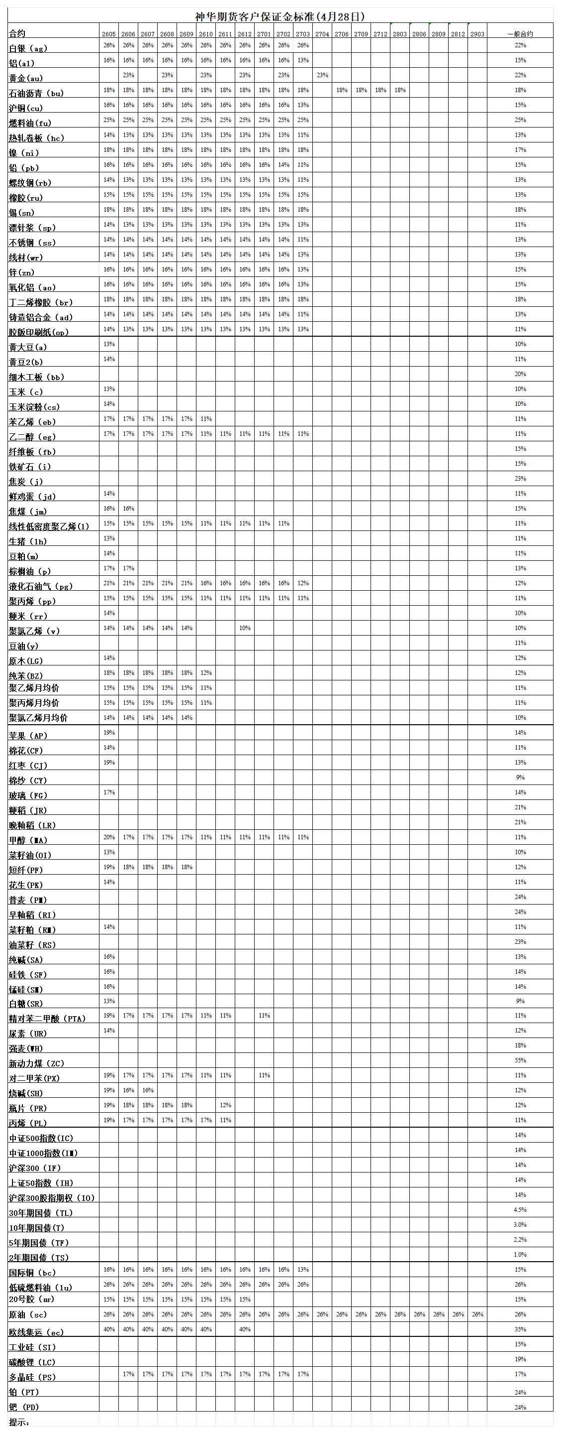 神华期货客户保证金标准(4月28日)